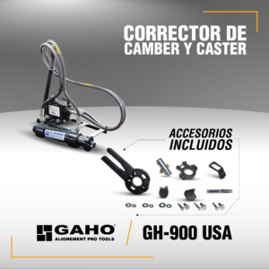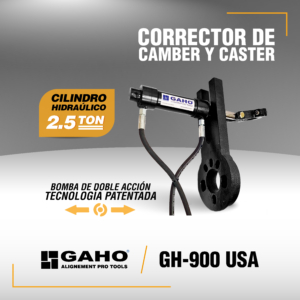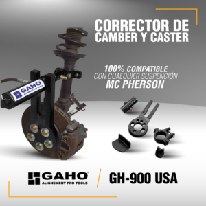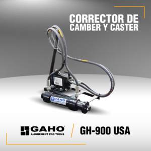 GAHO GH-900 es un equipo especialmente diseñado y fabricado para el servicio de corrección de los parámetros de Camber y Caster. El mismo está orientado para efectuar correcciones en el eje delantero de vehículos livianos con suspensión tipo McPherson